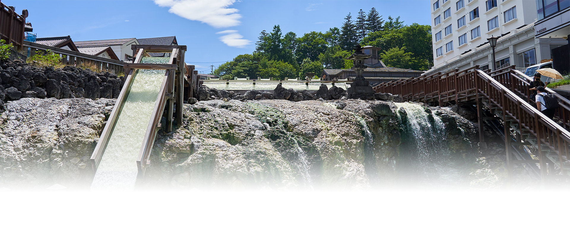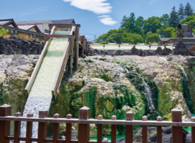 湯畑にある湯滝付近にマーカーポイントがあります。草津温泉といえば、この湯滝を思い浮かべる人も多いのでは!?代表的なフォトスポットで、自撮りスタンドも設置。湯滝を眺めながら足湯を楽しめます。