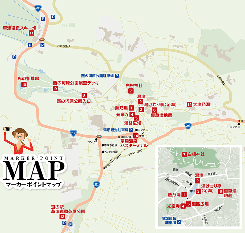 施設内「観光情報スペース」にマーカーポイントがあります。草津の玄関口にあり、多様なおみやげが揃っております。ちょっとした変わり種も!●営業時間/8:30~17:00●駐車場/大型5台、普通車48台