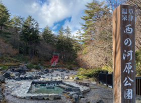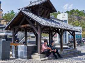 湯畑側公園入口の手洗乃湯周辺にマーカーポイントがあります。近くに足湯があり、ほっと一息をつけます。少し先には、草津穴守稲荷神社があり、「招福の砂」と呼ばれる、ご利益のある砂が置いてあります。