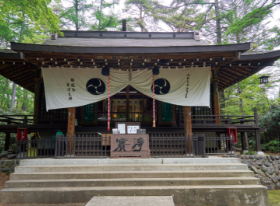 神社境内の鳥居周辺にマーカーポイントがあります。草津温泉の氏神として日本武尊が祀られていて、例年5月には、アズマシャクナゲが見ごろを迎えます。また神社周辺には、歌碑など歴史を記す物が多くあります。